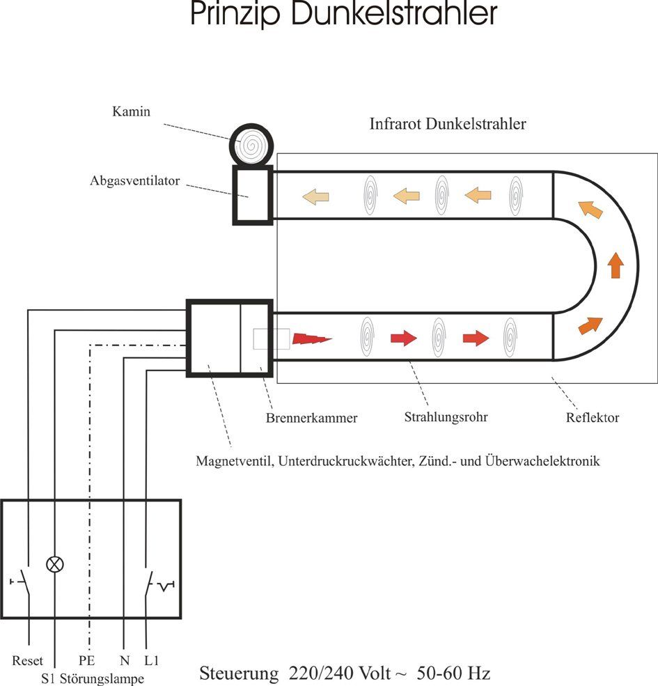 Dunkelstrahler sind Feuerstätten, versehen mit Abgaskamin und alle 2 Jahre (lt. DVGW (Deutsche Vereinigung des Gas- und Wasserfaches e.V.) Technische Regel Arbeitsblatt G 638-2) von einem Schornsteinfeger zu überprüfen.